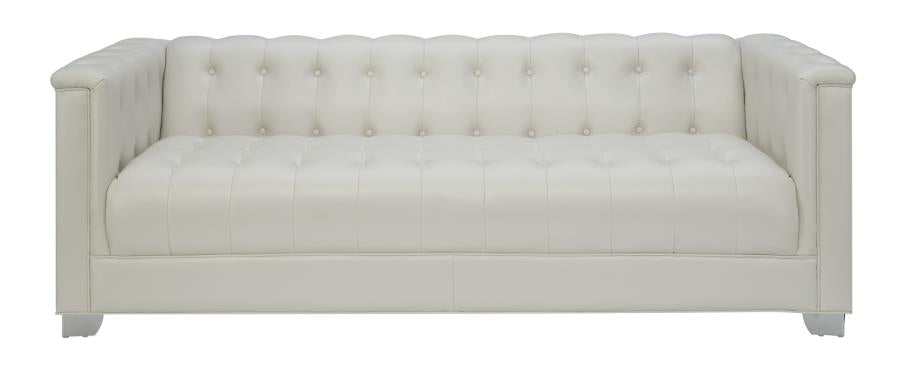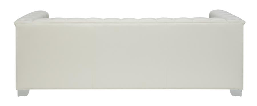 Transform your living room with chic, contemporary style. This stunning sofa is impeccably designed with a smooth, sleek silhouette. Upholstered in padded, breathable, pearl white leatherette, it exudes cool, comfortable glamour. Deep button tufting and chrome doorknocker handles give it a bold, modern edge. High-shine chrome legs pull its look together in stylish harmony.