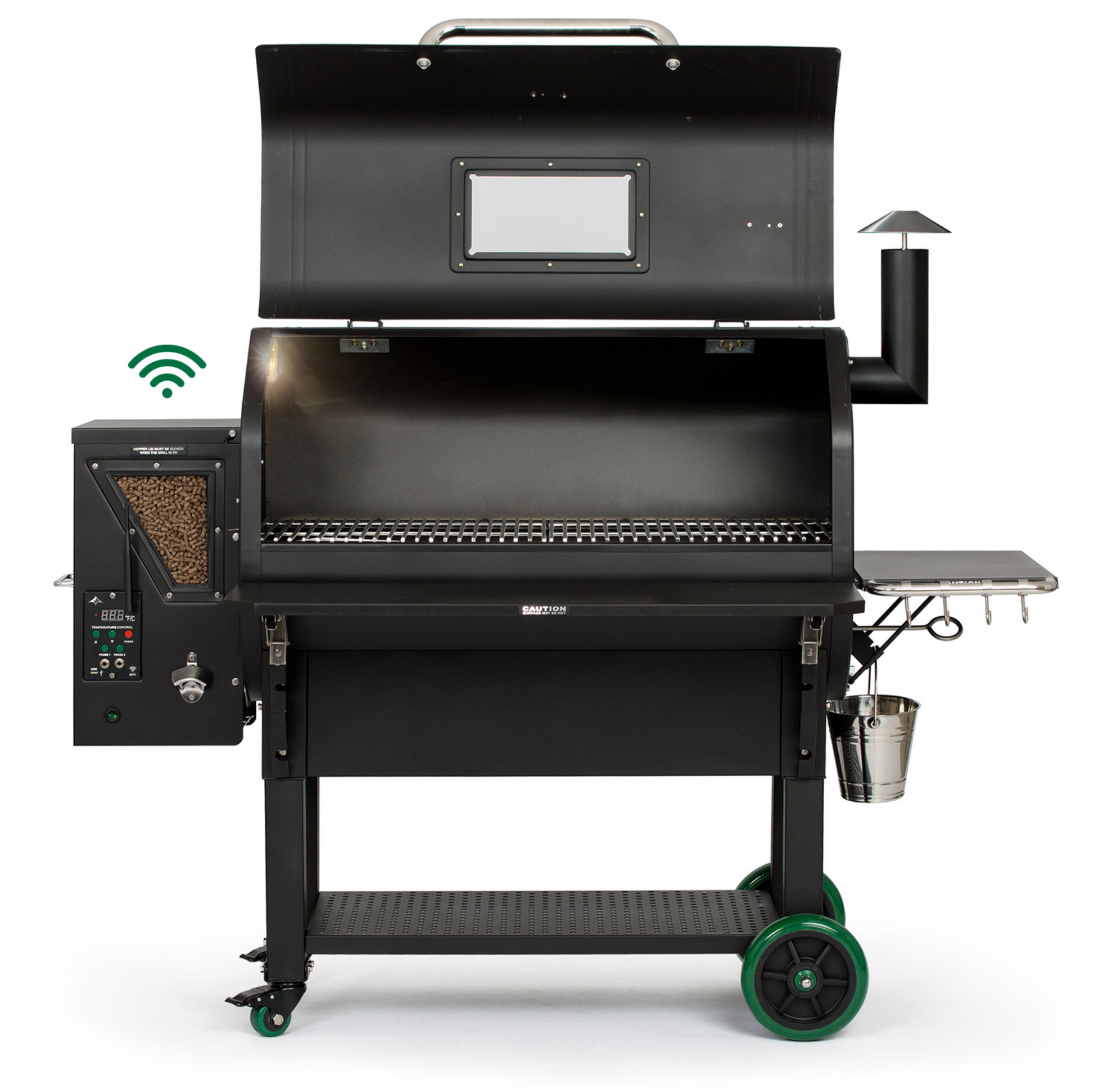 The PEAK PRIME model comes with a redesigned digital controller that allows you to control and monitor your grill through our iOS or Android mobile application, dual meat probes and a USB port. With the new grill and pellet view windows you can keep an eye on your food without letting smoke/heat escape and see your pellet supply. Our 13.5 in. peaked lid provides enough space for a stand-up chicken to a dozen racks of ribs. Keep all of your grilling tools handy by hanging them on the utensils hooks of your side convenience tray. All of our grills have a venturi-style firebox that creates a cyclone flame that ensures maximum combustion. They also have Sense-Mate, a thermal sensor that constantly monitors the ambient temperature. When the weather gets cold, the sensor kicks the grill into Turbo Mode, so you don’t have to wait long for the grill to heat up! Other features include Keep Warm Mode and Fan Only Mode with automatic shut-off to blow ash out of the firebox after you finish grilling.