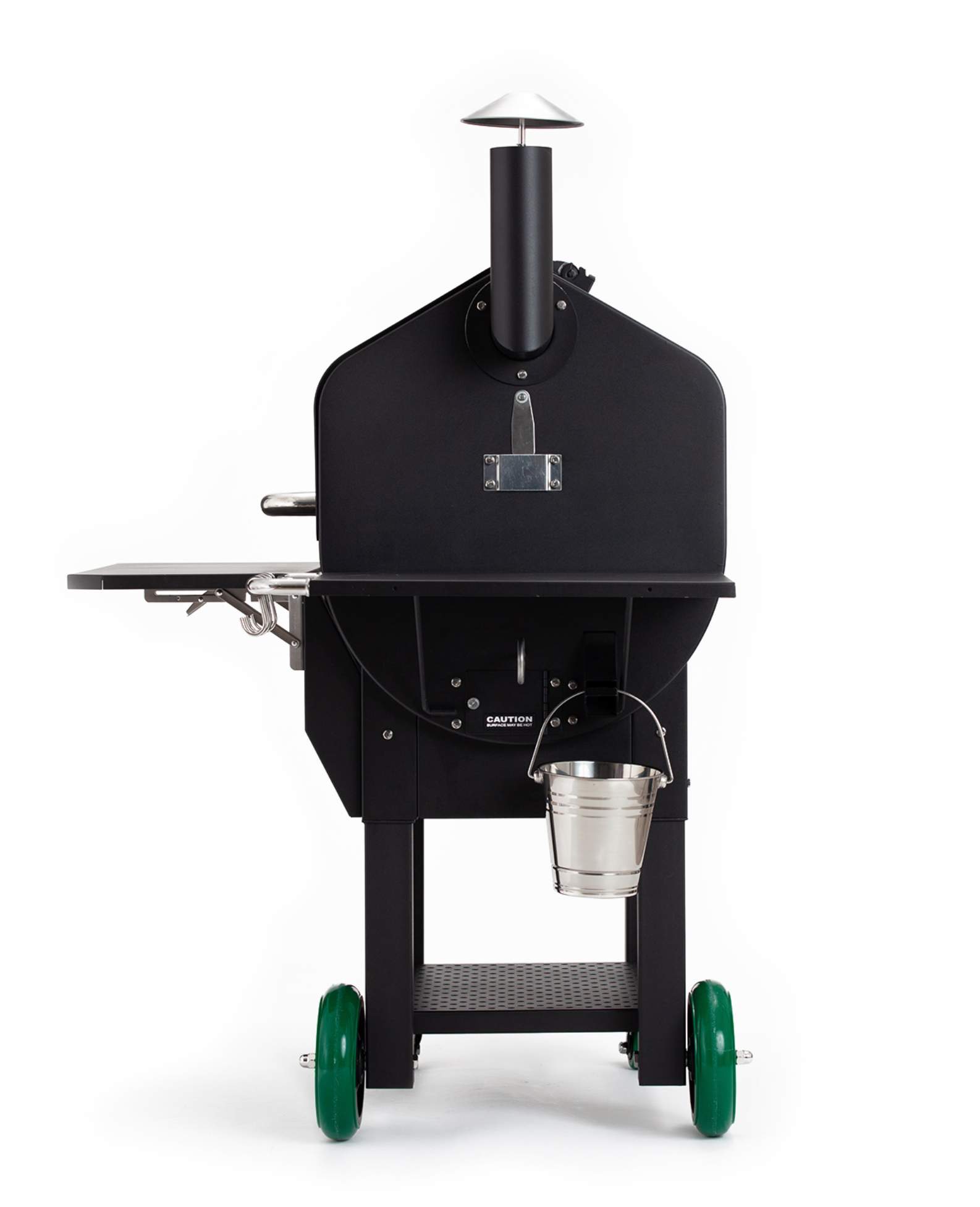 A motor turns the auger which feeds pellets into the firebox. There, a heat rod automatically ignites the pellets and a variable speed fan keeps them burning. The Venturi-style firebox is lined with vertical vents creating a burn pot cyclone of air flow for maximum heat and complete combustion of the pellets with minimal waste. A heat shield creates an even distribution of heat and pure hardwood smoke throughout the grill chamber.