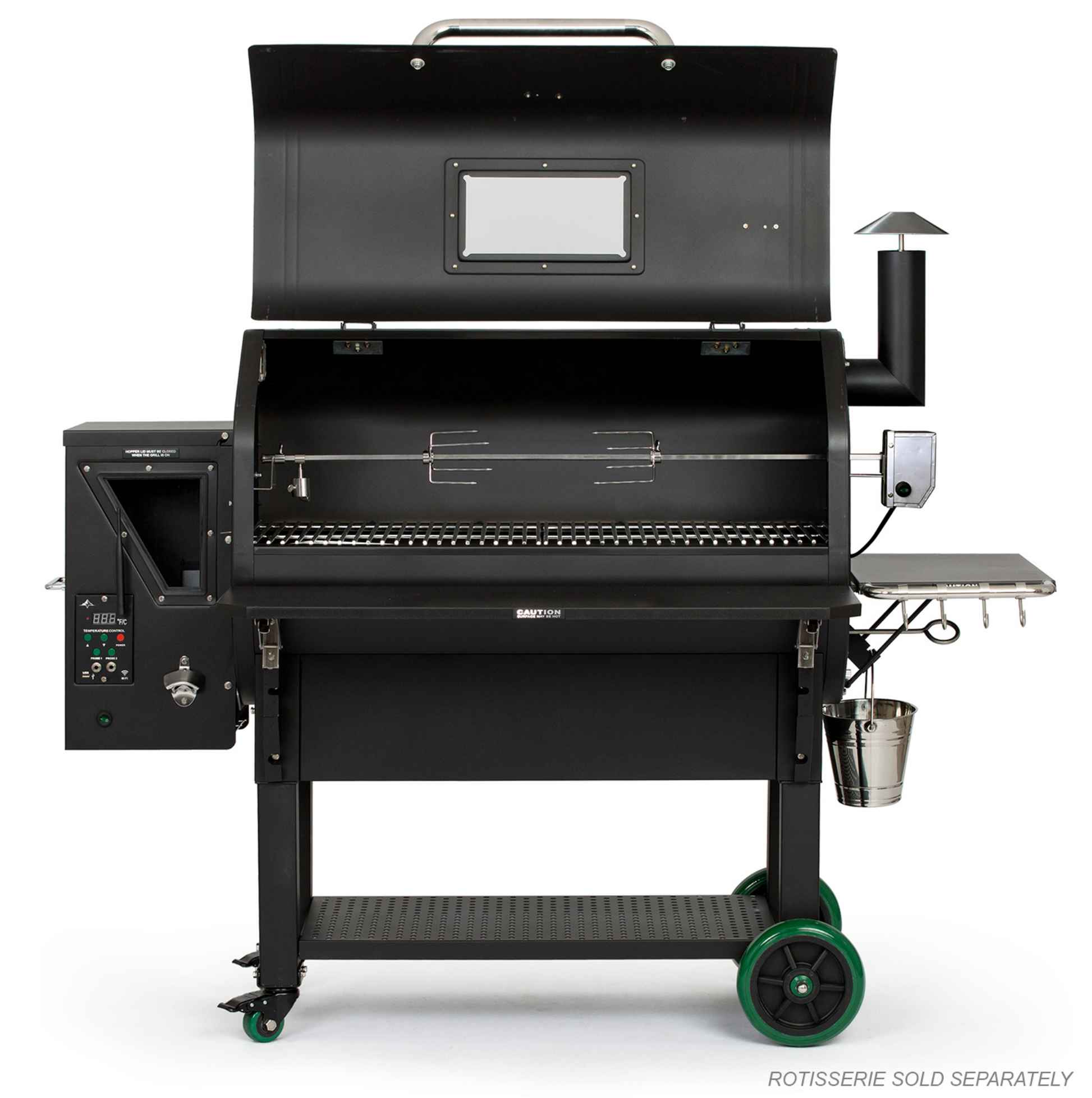 Our new Prime grills just got even better with the same great Prime features PLUS a collapsible front shelf, interior grill light, rotisserie enabled mounting and stronger reinforced grates. Our Prime models are built even smarter and stronger. 12V direct power design provides better temp control, greater pellet fuel economy and faster startups! With micro-adjustment capability in the variable-speed fan and auger motor, you can maintain more consistent grill temps. With the grill and pellet view windows you can keep an eye on your food without letting your smoke escape and monitor your pellet supply. With a 13.5” peaked lid and 658 sq. in. of grill space this workhorse can cook anything from a dozen racks of ribs to a small whole hog and monitor multiple food temps with dual meat probes.
